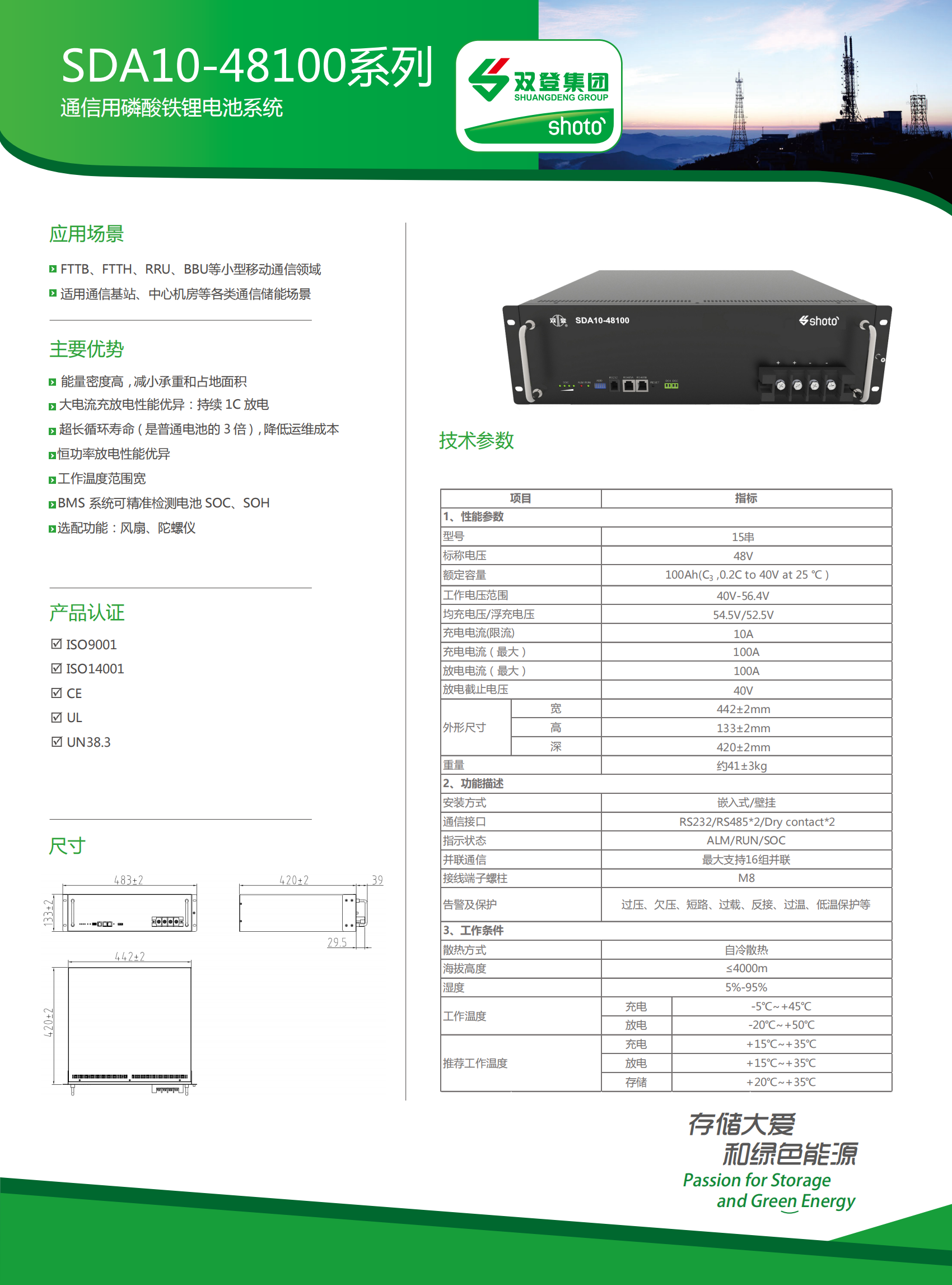 产品描述:48V锂电池具有能量密度高、循环寿命长、自放电率小、无记忆效应和绿色环保等优点,在电力储能领域具有广阔的应用前景。双登一直致力于提高锂电池的体积比能量、重量比能量、电池一致性和安全性等方面的研究。