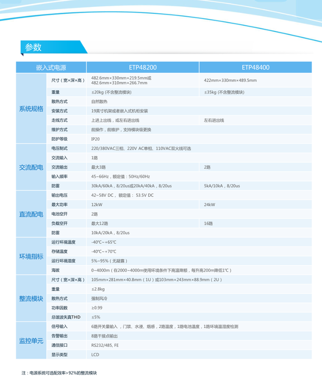 产品描述:ETP4860-B1A2是嵌入式电源系统,给–48VDC系列的通信设备供电,大输出电流为60A。系统特点电源系统支持交流或HVDC直流输入。交流输入时,电压范围为85VAC~300VAC;HVDC直流输入时,电压范围为85VDC~420VDC完善的电池管理功能网络化设计,SMU11B提供北向FE、南向RS485、CAN,SMU11C提供北向RS485、南向RS485、CAN具有通信、告警等功能,支持远程监控和在线升级支持整流模块、监控模块热插拔。