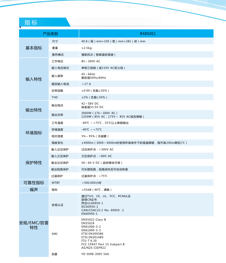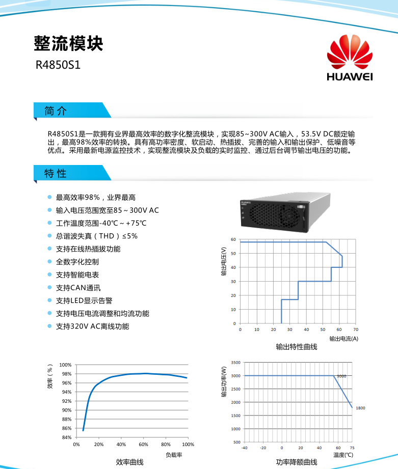 产品描述:R4850S1是一款拥有业界最高效率的数字化整流模块,实现85~300V AC输入,53.5V DC额定输出,最高98%效率的转换。具有高功率密度、软启动、热插拔、完善的输入和输出保护、低噪音等优点。采用最新电源监控技术,实现整流模块及负载的实时监控、通过后台调节输出电压的功能。