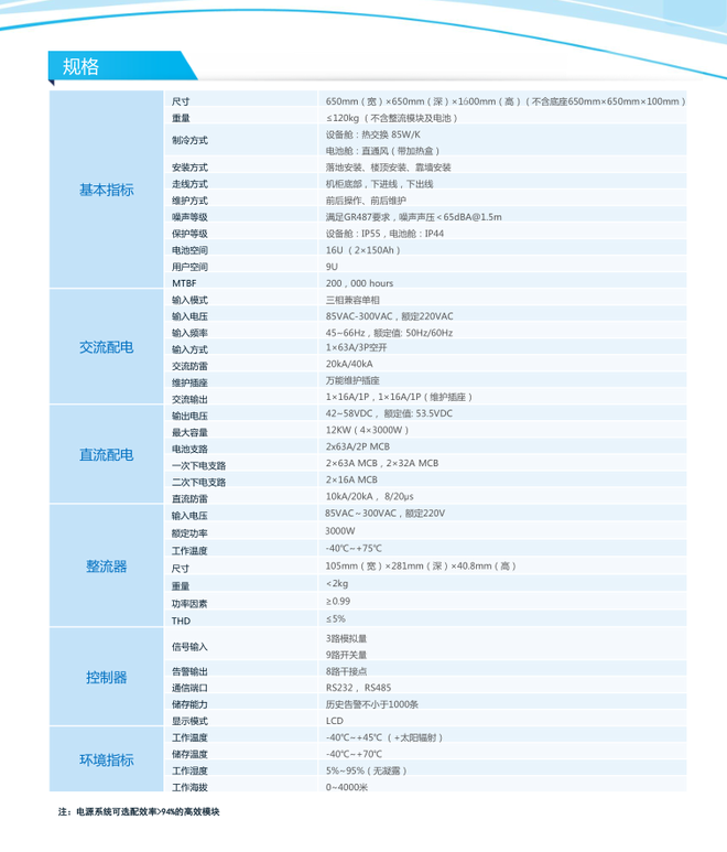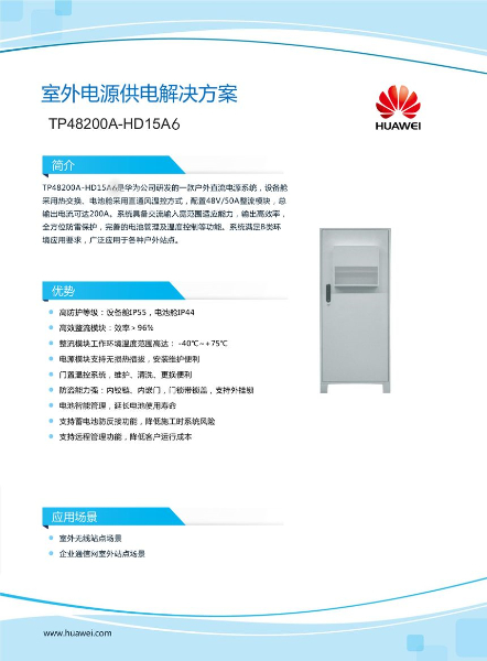 产品描述:TP48200A-HD15A6是华为公司研发的一款户外直流电源系统,设备舱采用热交换、电池舱采用直通风温控方式,配置48V/50A整流模块,总输出电流可达200A。系统具备交流输入宽范围适应能力,输出高效率全方位防雷保护,完善的电池管理及温度控制等功能。系统满足B类环境应用要求,广泛应用于各种户外站点。