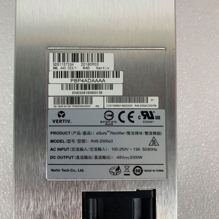 艾默生标效整流模块标称输出电压:48V,标称输出电流50A,输出功率:2000W,R48-2000E3模块满足RoHS要求,通过TUV、CE、UL认证,采用新电源监控技术,实现整流模块及负载的实时监控、通过后台调节输出电压的功能。