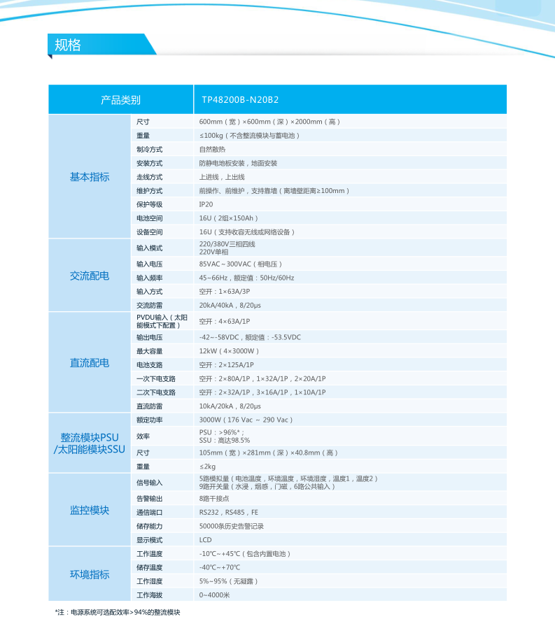 产品描述:华为TP482000B-N20B2是华为推出的集交流输入、整流、直 流配电为一体的机房大电源系统系统可桑性兼容380Vac 与220Vac电网,最大容量2400A,采用1U超高效整流模 块和先进的监控单元,为客户提供高可靠、高效节能、方 维护的-48V直流电源供电解决方案。
